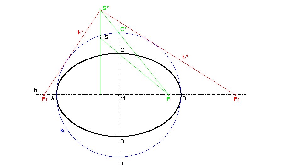 Man schneidet die Verbindungsgerade SC mit h, den Schnittpunkt F verbindet man mit den Schnittpunkt C* von n mit kh und der Normalen zu h durch S, so erhält man den Punkt S*. (S* ist das Bild von s bei der orthogonalen perspektiven Affinität zwischen Hauptscheitelkreis und Ellipse.)