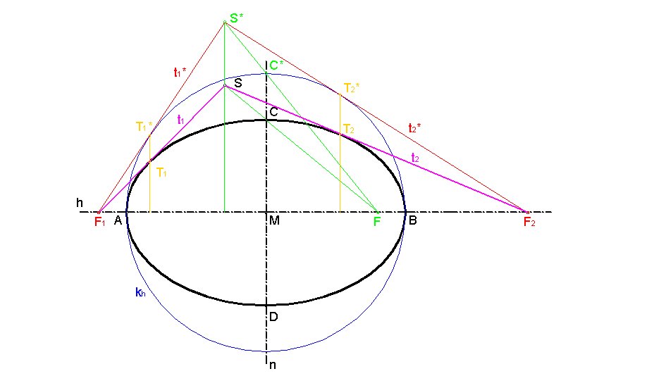 Man konstruiert die Tangenten t1* und t2* aus s* an den Hauptscheitelkreis. Schnittpunkte von t1* und t2* mit h heißen F1 und F2.