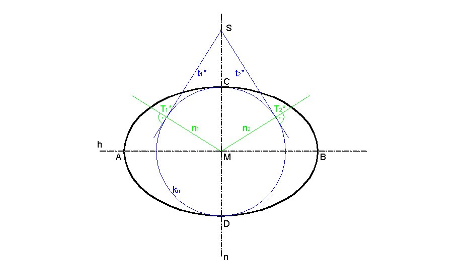 Man zeichnet den Nebenscheitelkreis kn und bestimmt die Tangenten t1* und t2* aus S an kn.