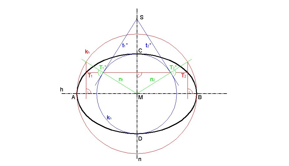 Man zeichnet den Hauptscheitelkreis kh und konstruiert mit n1 und n2 mittels der Punktkonstruktion nach De la Hire die Ellipsenpunkte T1 und T2.