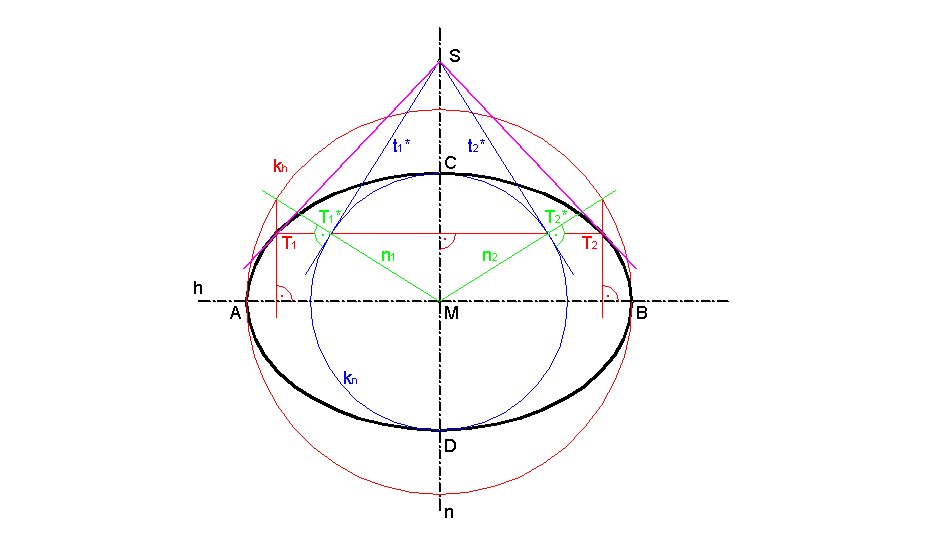 Man zeichnet den Nebenscheitelkreis kn und bestimmt die Tangenten t1* und t2* aus S an kn.
