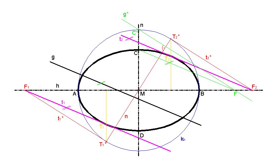 Man zeichnet die Normale zu g* durch den Ellipsenmittelpunkt M und in den Schnittpunkten T1* und T2* der Normalen mit kh die Tangenten t1* und t2* an den Hauptscheitelkreis kh. Schnittpunkte von t1* und t2* mit h heißen F1 und F2.