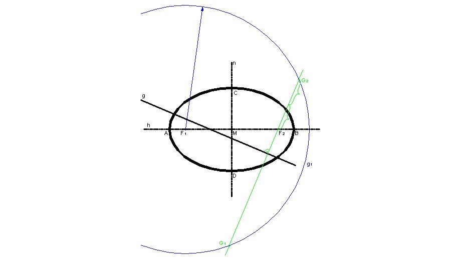 Man zeichnet die Normale zu g durch den zweiten Brennpunkt F2 und schneidet diese Normale mit den Gegenpunktekreis g1, die Schnittpunkte heißen G1 und G2.