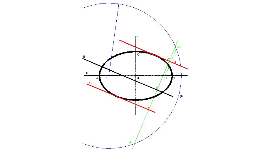 Man zeichnet die Normale zu g durch den zweiten Brennpunkt F2 und schneidet diese Normale mit den Gegenpunktekreis g1, die Schnittpunkte heißen G1 und G2.