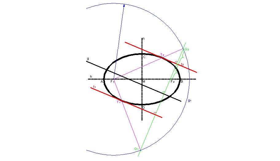 Man zeichnet die Normale zu g durch den zweiten Brennpunkt F2 und schneidet diese Normale mit den Gegenpunktekreis g1, die Schnittpunkte heißen G1 und G2.
