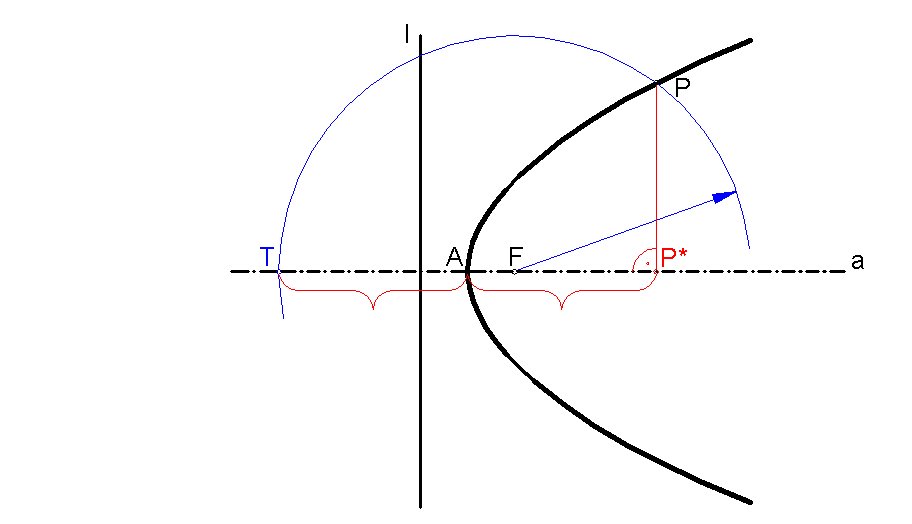 - Man zeichnet einen Kreis um F durch P und schneidet